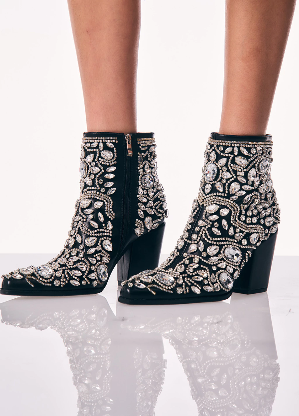 - Aplicaciones de cristales y pedrería en patrón ornamental.