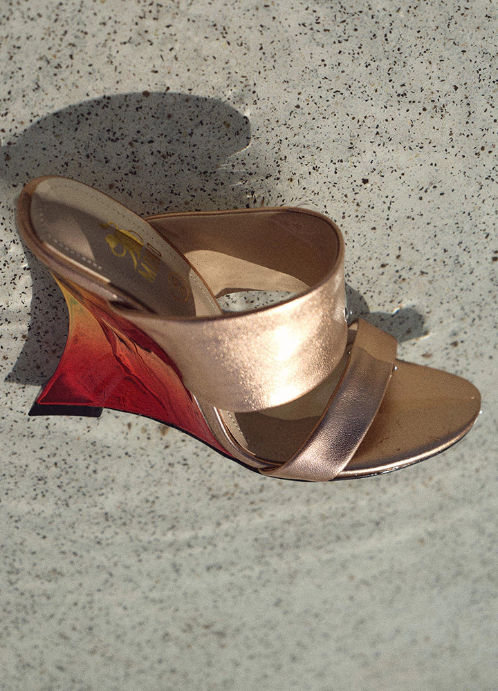 Taco en cuña, con un efecto degradé que va del amarillo al rojo intenso, creando un look llamativo y artístico.