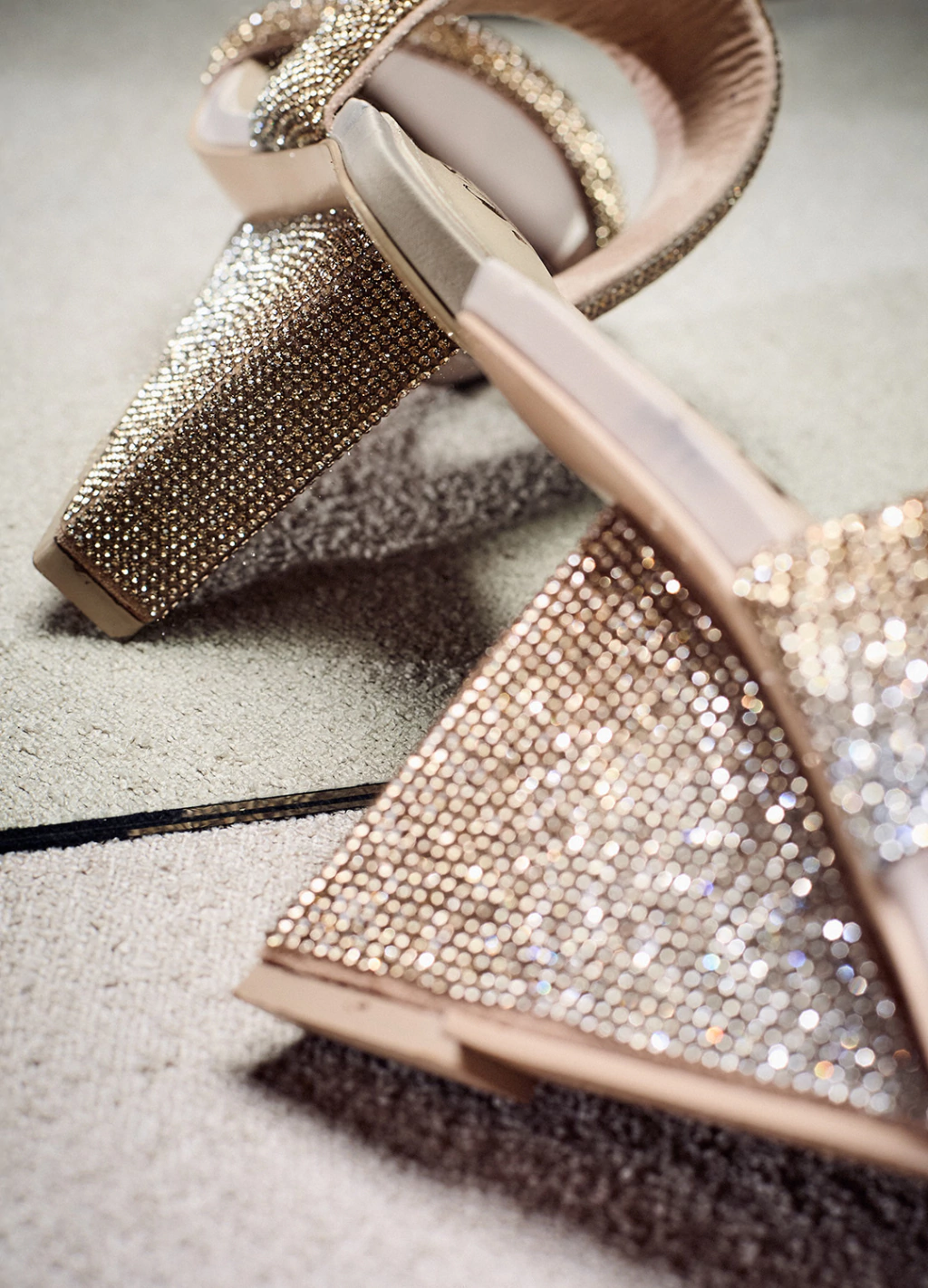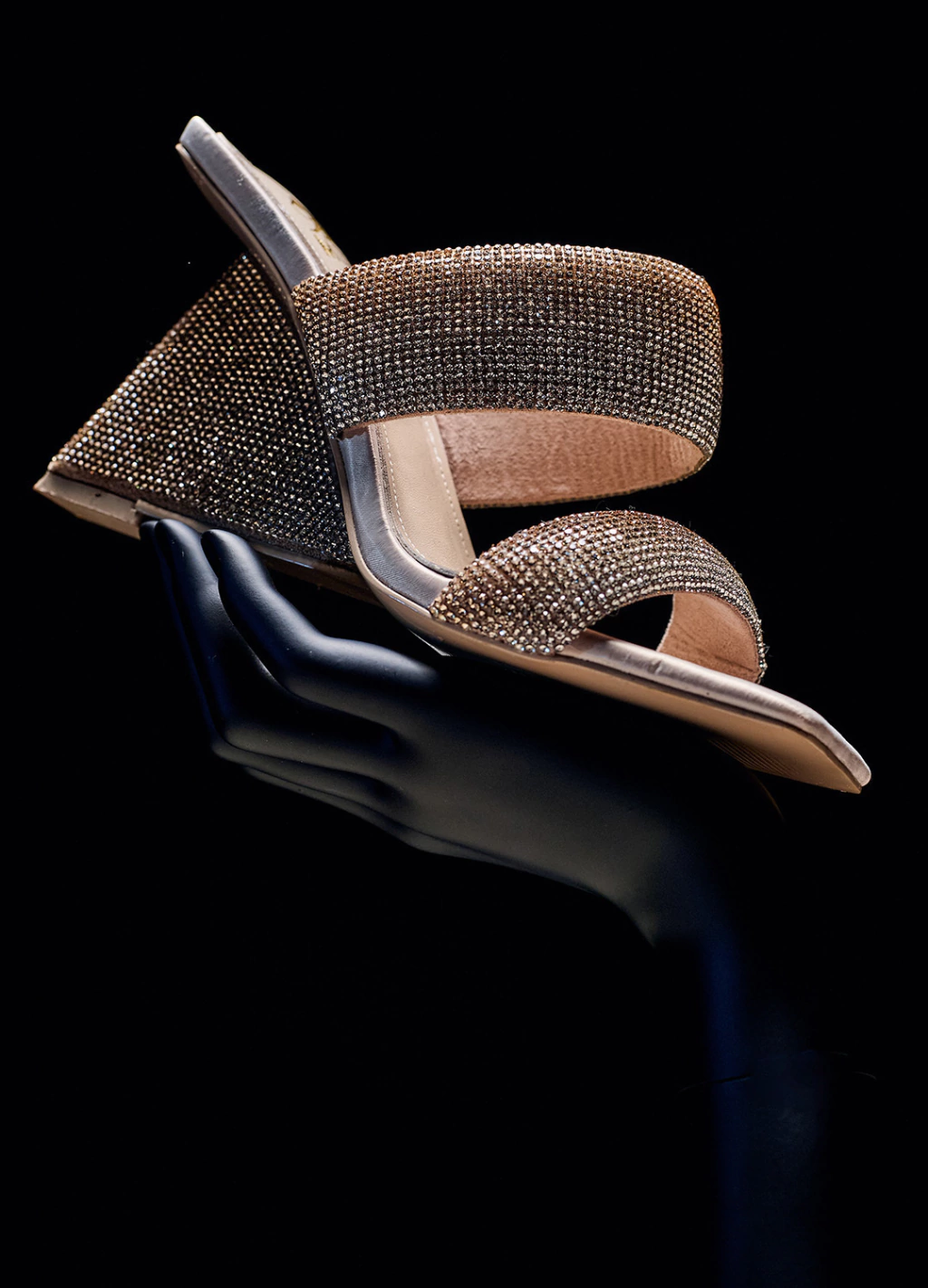 - El taco es alto y ancho, lo que le da estabilidad. Está decorado con los mismos cristales que las correas, creando un efecto de brillo continuo.