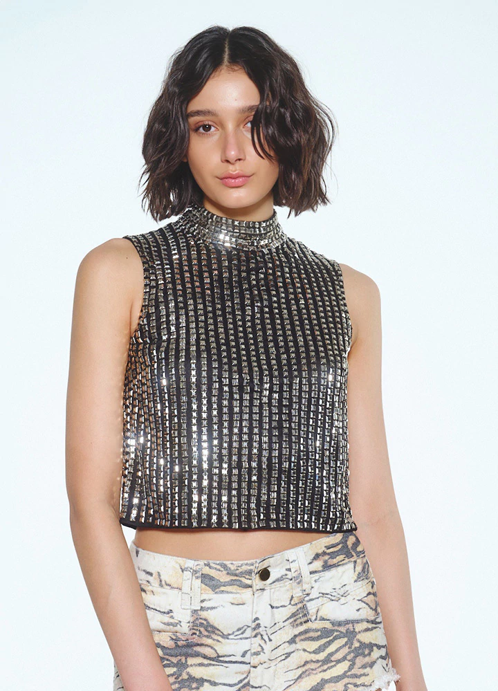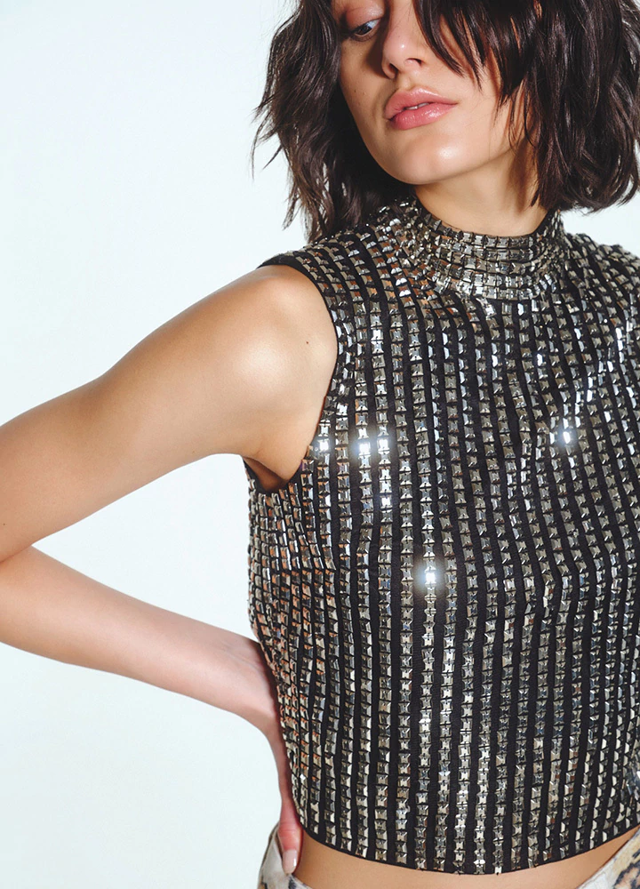 El Top Nixi está confeccionado en base de crepé negro de alta calidad, cubierto por líneas verticales de apliques metálicos facetados que capturan la luz como pequeñas joyas.