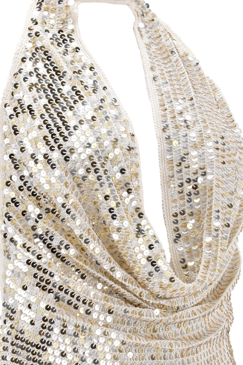 - Está cubierto de pequeñas lentejuelas brillantes que reflejan la luz, dándole un aspecto sofisticado y festivo.