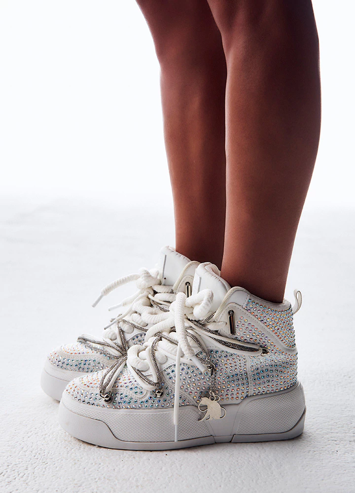- Detalles de ojales con cordones anchos y finos y una tira delicada de strass.